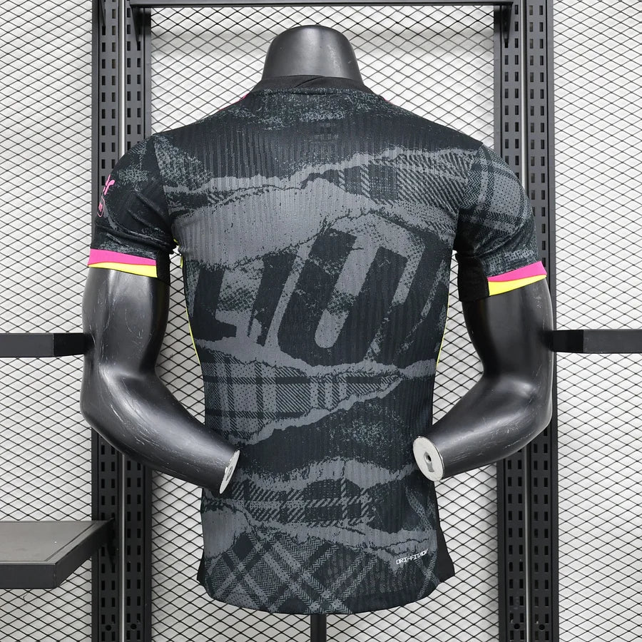 Step outside the ordinary with Chelsea’s 2024/25 Third Kit. Featuring a striking black base accentuated by electric blue and neon orange flash stripes across the chest and sleeves, this bold design demands attention. Crafted with performance-driven Dri-FIT technology and tailored for match-day comfort, it’s built to stand out both on the pitch and in the streets. Ideal for fans who want to showcase fearless style and unwavering Blues pride.